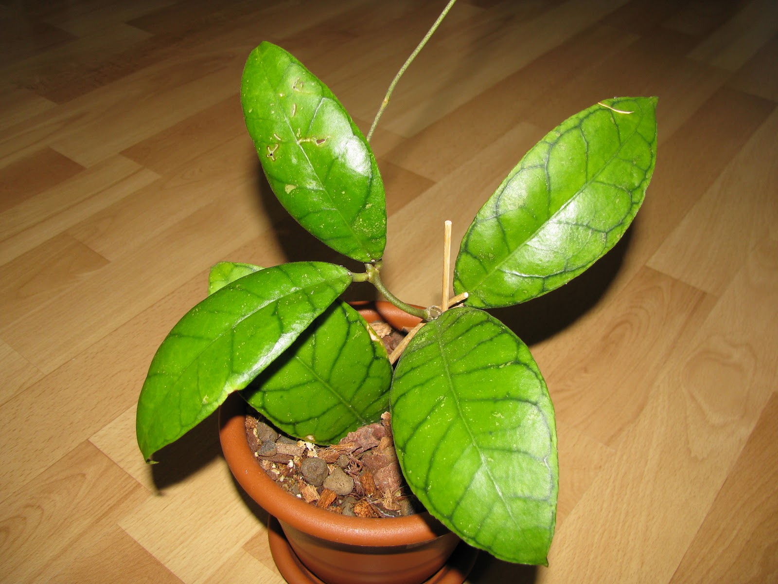 Kolejna Szwedka, która w zeszłym roku przyleciała, pod koniec lata. Rośnie, jakby chciała, a nie mogła. Ukorzeniła się dość szybko. I na tym się skończyło. Stała całą jesień, zimę, wiosnę. Dopiero niedawno dała oznaki życia w postaci wypuszczenia liścia. Tak się tym zmęczyła, że postanowiła znowu odpocząć przed kolejnym liściem. W efekcie, kolejny liść kluje się już dwa tygodnie i rośnie, rośnie, jakby chciał, a nie mógł. Najbardziej powolna hoja jaką mam. Mnie to nie przeszkadza, przy takiej ilości, powolność w rośnięciu staje się zaletą, nie wadą.